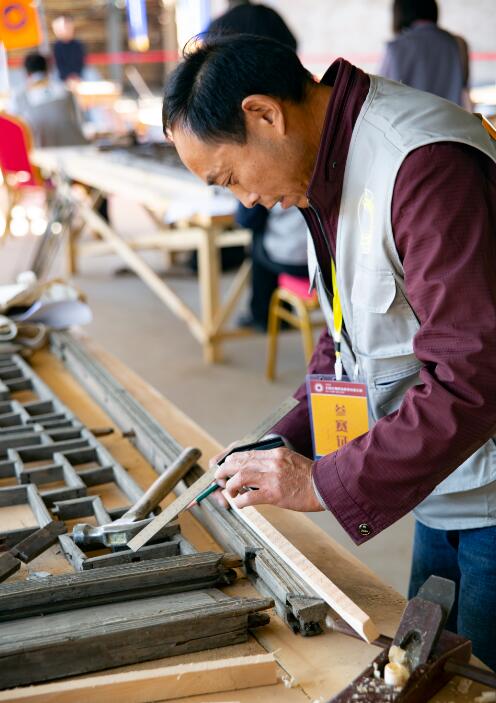 木构修复比赛中,所选修复构件为旧门窗。笔试主要考核选手是否能够准确地识别木构件的名称、材质,以及对残损状况的描述,并根据残损状况编写修复方案,绘制草图,并在规定的时间里完成修复。