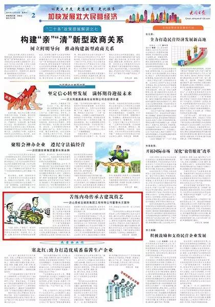“所有的民营企业都是改革开放的受益者,山西古建集团将以此次大会为契机,履行社会责任,把握时代大势,在市委、市政府的正确领导下,坚定发展信心,秉承光大民族传统、铸就古建伟业的企业理念,苦练内功,传承古建筑技艺,心无旁骛创新创造,遵纪守法搞经营,踏踏实实办好企业,在合法合规中提高企业创新竞争能力,不断开辟更加光明的发展前景。”王国华信心满满地表示。( 12月22日,《大同日报》就大同市委、市政府鼓励支持民营企业发展“二十条”政策措施的出台对山西省古建筑集团董事长王国华进行了专访,以上为原文)