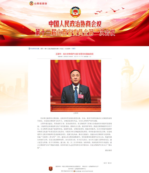 1月14日,省政协委员、山西省古建筑集团董事长王国华围绕《加大文物保护力度 彰显文化强省自信》为题进行发言,从坚持政府主导,落实政策供给;借助社会力量,做好保护利用;文物活化利用,赋能乡村振兴;挖掘文化内涵,推动文旅融合;加大扶持力度,壮大匠人队伍五方面提出建议。切实扛起山西文物大省的责任与担当,全方位推动山西文物事业高质量发展。
