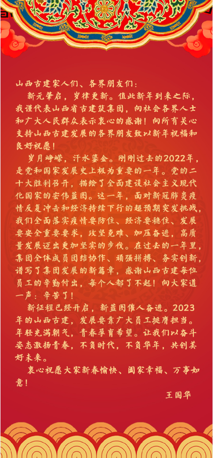 新元肇启,岁律更新。值此新年到来之际,我谨代表山西省古建筑集团,向社会各界人士和广大人民群众表示衷心的感谢!向所有关心支持山西古建发展的各界朋友致以新年祝福和良好祝愿!