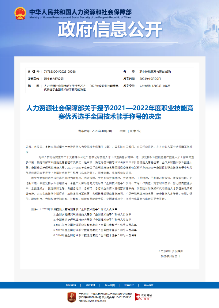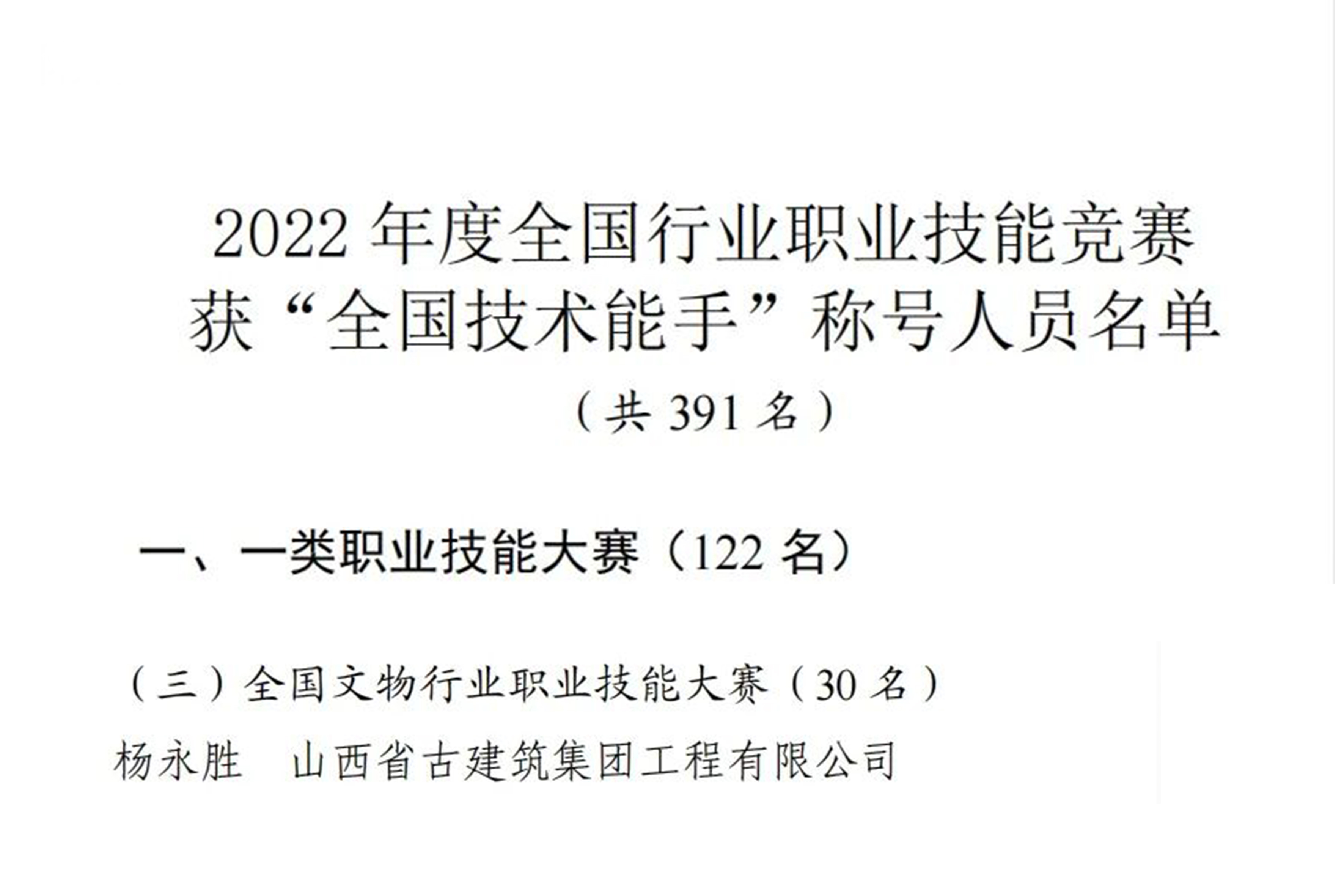 近日,人力资源社会保障部向一批在2021—2022年度全国行业职业技能竞赛中取得优异成绩的选手授予“全国技术能手”称号,山西省古建筑集团员工杨永胜同志获此殊荣。