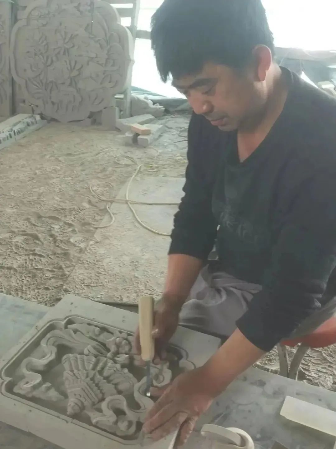 在没有古建修复任务时,杨永胜的主要工作就是做砖雕,“我喜欢这个行业,喜欢砖雕,每天做自己喜欢的事情才是有意义的,经常一做就是一天,在别人看来或许有些枯燥,但是我却感觉时间过得特别快。”砖雕的技术含量高,杨永胜也没有系统学习过,全靠自己去琢磨,去观察。“一开始雕的是房檐下面的樨头,有时候就给雕坏了,然后我就自己买砖,一块一块的试,直到熟练为止。”