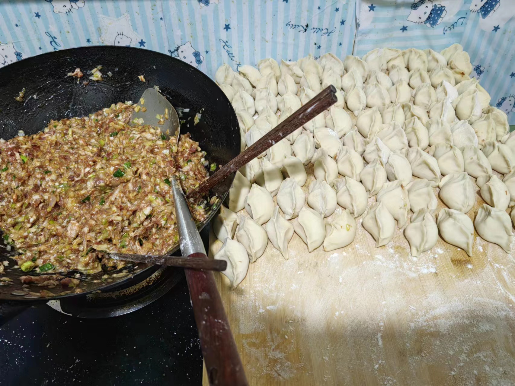 大家配合默契,个个动作娴熟,用自己拿手的方式包着各式各样的饺子,有的负责包饺子,有的负责擀饺子皮,有的负责摆放包好的饺子。活动现场气氛和谐,有说有笑,相互交流着擀皮和包饺子的技巧,讲述着冬至节气的重要意义。