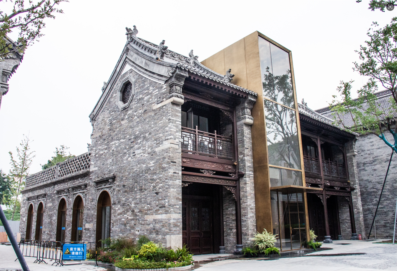 墙体使用旧青砖材料砌筑,采用五顺一丁或梅花丁或三顺一丁的淌白或丝缝墙,将混凝土主体结构包裹成仿古建筑;使用干摆的砌筑方式将其严丝合缝的拼成一个墀头砖雕;屋脊采用正脊与垂脊组合并配有正吻和垂兽,使仿古建筑更具有古建筑的精气神;屋面瓦瓦方式也分为合瓦屋面、筒瓦屋面、仰瓦屋面。门窗采用现代化工艺、时尚简约的极窄边框玻璃门,极大的增加了采光与整体效果。石材采用老石材材料,老石料经过匠人们的精心雕琢最后变成带有不同含义的条文图案,为建筑增添了气息。