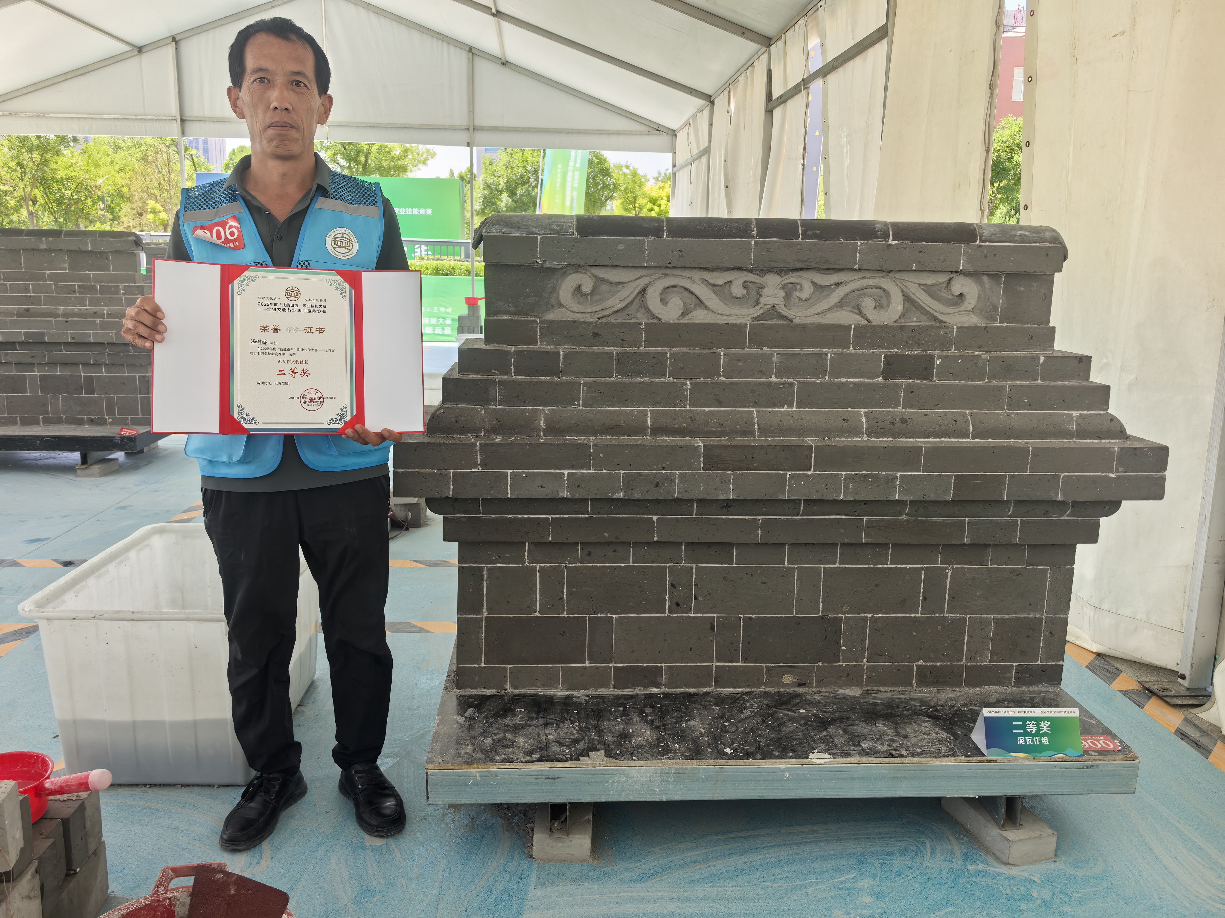 山西省古建筑集团参赛选手沉着应战,在木作文物修复项目中,凭借对传统榫卯结构、古建形制的精准把控,以及对工具运用、细节处理的极致追求,一举包揽该项目一、二等奖。在泥瓦作文物修复项目中,选手以娴熟的传统灰浆配比技艺、古法铺作工艺,荣获二等奖。